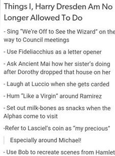 I love Murph, too (and not just because we’re both the same height), and seriously hope she and Dresden finally hook up. And I love the memes, especially the list of things he’s not allowed to do 🤣
