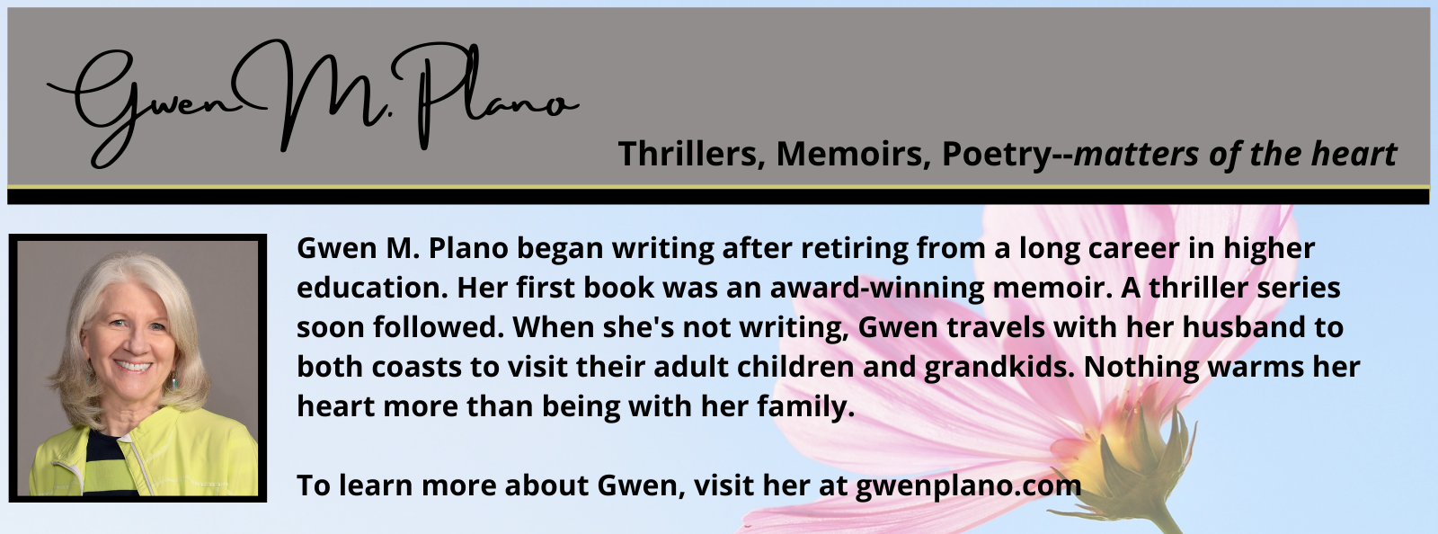 Today, I’m very happy to have my good friend Gwen Plano visiting with us. Gwen is a gifted writer, a contributor to the wonderful #StoryEmpire blog, and a blogger in her own right, as well. Please join me in welcoming Gwen as she tells us a bit about herself and her background. Take it away, my friend!
