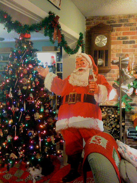 A full-length photo of my six-foot tall Santa, with no lights out on the tree this time.