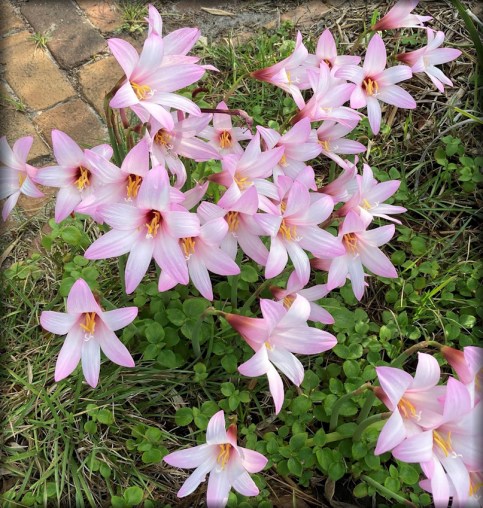 About ten years ago, Mark dug up a small Zephyr Lily, also called a Rain Lily, from a big, weedy patch along a roadside ditch and brought it home for my garden. Over the years, I’ve enjoyed the way the lily blooms after a rain, then often disappears completely. In fact, for the last two years or so, I figured it had finally died. No sign of stems or blooms in all those months. Then we had a monster thunderstorm Friday afternoon, and yesterday, I saw a few stems popping up. This morning, I was greeted by the pale pink splendor of my rain lilies celebrating Friday’s downpour.