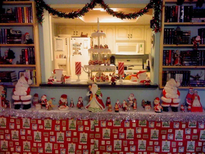 This is the other side of the wooden tree, looking back through the passthrough window. The bookshelf beneath it is where I display what I call my Holly Jolly Santas, or those with a modern look to them. This is an older picture, but this year’s display has 37 Santas, including some really neat ones from the 50s.