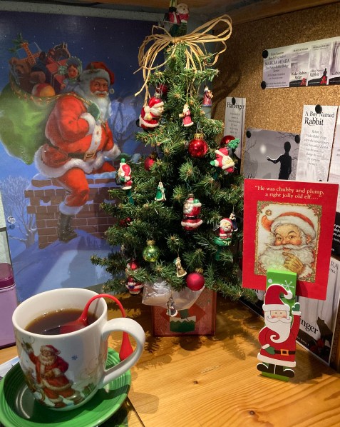 And speaking of our entryway, it always gets a mixture of Santas, including some advertising posters I’ve had for 50+ years. (Since my son was a baby.)
