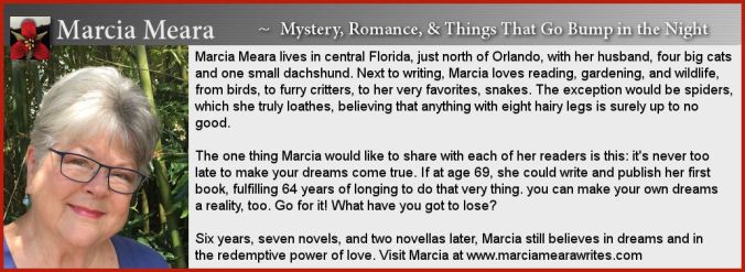 Marcia Meara lives in central Florida, just north of Orlando, with her husband of over thirty years and four big cats.