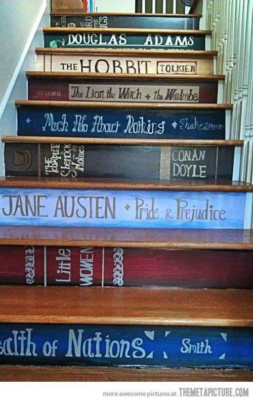 And finally, a bookshelf that’s really NOT, but reminds you of your favorite books every time you head upstairs. If we were still in our two-story house, I would SO do this!