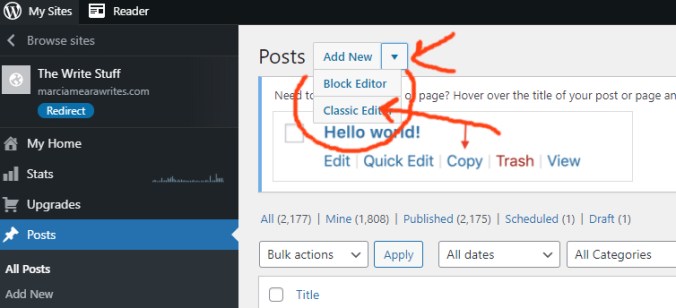 Then, you will have the same admin page as before this mess occurred. You can once again (as you used to do) click on “All Posts “ and at the top of that page, click on “Add New and choose Classic from the drop down menu.